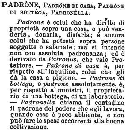 Padrone, Padrone di casa, Padrone di bottega, Padronella - Padrone è colui che ha diritto di proprietà sopra una cosa, e può venderla, donarla, disfarla; è ancora colui che ha potestà sopra persone soggette o salariate; ma si intende non con assoluta padronanza; ed è derivato da Patronus, che vale Protettore. - Padrone di casa è, per rispetto all'inquilino, colui che gli dà la casa a pigione. - Padrone di bottega, o padrone assolutamente, è, per rispetto a' ministri, il proprietario di una bottega, di un laboratorio. - Padronella chiama il contadino il padrone del podere che egli lavora, quando esso è poco abbiente, e non può fare le spese occorrenti alla buona coltivazione. [immagine]