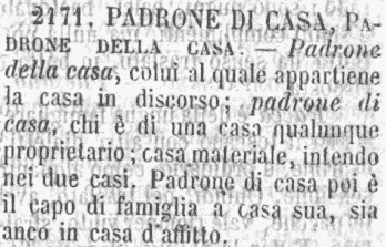 Padrone di casa, Padrone della casa - Padrone della casa , colui al quale appartiene la casa in discorso; padrone di casa, chi è di una casa qualunque proprietario; casa materiale, intendo nei due casi. Padrone di casa poi è il capo di famiglia a casa sua, sia anco in casa d'affitto. [immagine]
