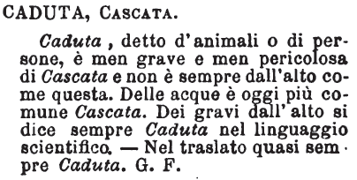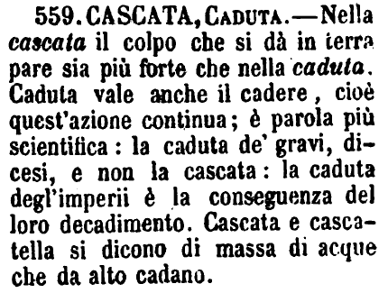 | Caduta, Cascata - Caduta, detto d'animali o di persone, è men grave e men pericolosa di Cascata e non è sempre dall'alto come questa. Delle acque è oggi più comune Cascata. Dei gravi dall'alto si dice sempre Caduta nel linguaggio scientifico. - Nel traslato quasi sempre Caduta. G. F. [immagine] |