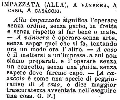 Impazzata (alla), A vanvera, A caso, A casaccio - Alla impazzata significa l'operare senza ordine, senza garbo, in fretta e senza rispetto al far bene o male. - A vànvera è operare senza arte, senza saper quel che si fa, tentando ora un modo ora l'altro. - A caso è il mettersi a un'impresa a cui non siamo preparati, e l'operare senza un concetto, senza una guida, senza sapere dove faremo capo. - [A casaccio è come una specie di peggiorativo di A caso, e dice maggior trascuratezza avventata nell'eseguire una cosa. G. F.] [immagine]