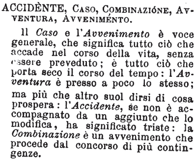 Accidente, Caso, Combinazione, Avventura, Avvenimento - Il Caso e l'Avvenimento è voce generale, che significa tutto ciò che accade nel corso della vita, senza essere preveduto; è tutto ciò che porta seco il corso del tempo: l'Avventura è presso a poco lo stesso; ma più che altro suol dirsi di cosa prospera: l'Accidente, se non è accompagnato da un aggiunto che lo modifica, ha significato triste: la Combinazione è un avvenimento che procede dal concorso di più contingenze. [immagine]