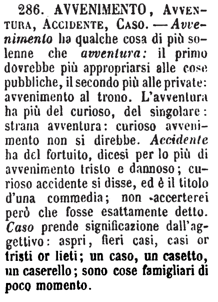 Avvenimento, Avventura, Accidente, Caso - Avvenimento ha qualche cosa di più solenne che avventura: il primo dovrebbe più appropriarsi alle cose pubbliche, il secondo più alle private: avvenimento al trono. L'avventura ha più del curioso, del singolare: strana avventura: curioso avvenimento non si direbbe. Accidente ha del fortuito, dicesi per lo più di avvenimento tristo e dannoso; curioso accidente si disse, ed è il titolo d'una commedia; non accerterei però che fosse esattamente detto. Caso prende significazione dall'aggettivo: aspri, fieri casi, casi or tristi or lieti; un caso, un casetto, un caserello; sono cose famigliari di poco momento. [immagine]