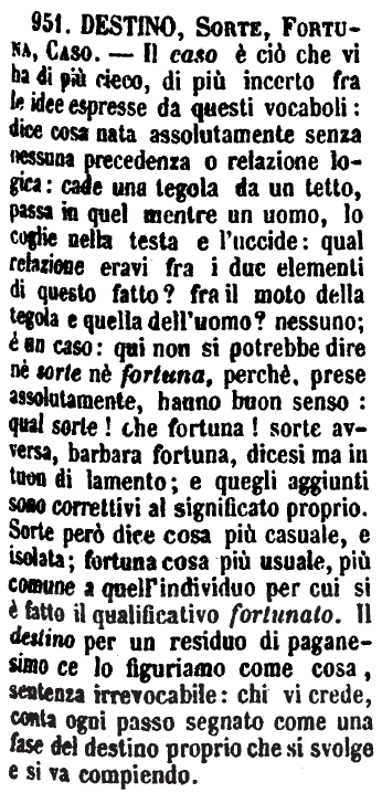 Destino, Sorte, Fortuna, Caso - Il caso è ciò che vi ha di più cieco, di più incerto fra le idee espresse da questi vocaboli: dice cosa nata assolutamente senza nessuna precedenza o relazione logica: cade una tegola da un tetto, passa in quel mentre un uomo, lo coglie nella testa e l'uccide: qual relazione eravi fra i due elementi di questo fatto? fra il moto della tegola e quella dell'uomo? nessuno; è un caso: qui non si potrebbe dire nè sortefortuna, perchè, prese assolutamente, hanno buon senso: qual sorte! che fortuna! sorte avversa, barbara fortuna, dicesi ma in tuon di lamento; e quegli aggiunti sono correttivi al significato proprio. Sorte però dice cosa più casuale, e isolata; fortuna cosa più usuale, più comune a quell'individuo per cui si è fatto il qualificativo fortunato. Il destino per un residuo di paganesimo ce lo figuriamo come cosa, sentenza irrevocabile: chi vi crede, conta ogni passo segnato come una fase del destino proprio che si svolge e si va compiendo. [immagine]
