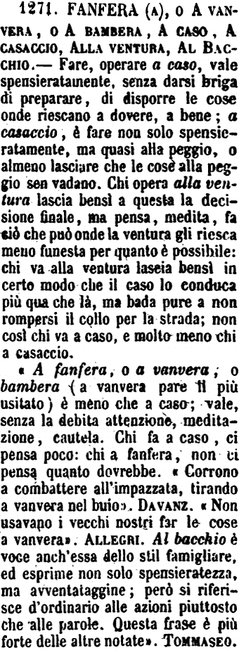 «A fanfera, o a vanvera, o bambera (a vanvera pare il più usitato) è meno che a caso; vale, senza la debita attenzione, meditazione, cautela. Chi fa a caso, ci pensa poco: chi a fanfera, non ci pensa quanto dovrebbe. «Corrono a combattere all'impazzata, tirando a vanvera nel buio». Davanz. «Non usavano i vecchi nostri far le cose a vanvera». Allegri. Al bacchio è voce anch'essa dello stil famigliare, ed esprime non solo spensieratezza, ma avventataggine; però si riferisce d'ordinario alle azioni piuttosto che alle parole. Questa frase è più forte delle altre notate». Tommaseo. [immagine]