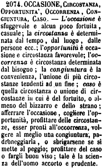 Occasione, Circostanza, Opportunità, Occorrenza, Congiuntura, Caso - L'occasione è sfuggevole e alcun poco fortuita, casuale; la circostanza è determinata dal tempo, dal luogo, dalle persone ecc.; l'opportunità è occasione e circostanza favorevole; l'occorrenza è circostanza determinata dal bisogno; la congiuntura è la convenienza, l'unione di più circostanze tendenti ad un fine; caso è quella circostanza o unione di circostanze in cui è del fortuito, o almeno del bizzarro e dello strano; afferrare l'occasione, cogliere l'opportunità, profittare delle circostanze, esser pronti all'occorrenza, volgere al meglio una congiuntura, padroneggiarla, o sbrigarsene se si mette al peggio; profittare del caso o fargli buon viso; tale è la scienza dell'uomo accorto e prudente. [immagine]