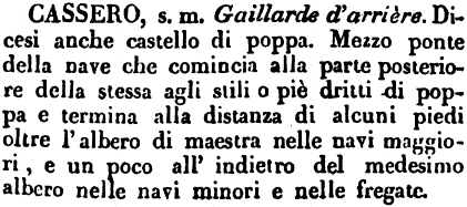 | Cassero - s. m. Gaillarde d'arrière. Dicesi anche castello di poppa. Mezzo ponte della nave che comincia alla parte posteriore della stessa agli stili o piè dritti di poppa e termina alla distanza di alcuni piedi oltre l'albero di maestra nelle navi maggiori, e un poco all'indietro del medesimo albero nelle navi minori e nelle fregate. [immagine] |