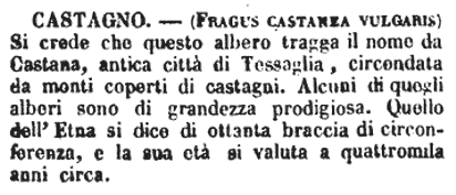 | Castagno - (Fragus castanea vulgaris) Si crede che questo albero tragga il nome da Castana, antica città di Tessaglia, circondata da monti coperti di castagni. Alcuni di quegli alberi sono di grandezza prodigiosa. Quello dell'Etna si dice di ottanta braccia di circonferenza, e la sua età si valuta a quattromila anni circa. [immagine] |