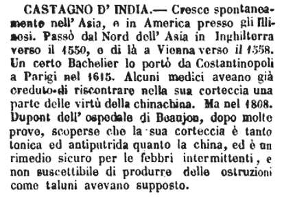 | Castagno d’india - Cresce spontaneamente nell'Asia, e in America presso gli Illinosi. Passò dal Nord dell'Asia in Inghilterra verso il 1550, e di là a Vienna verso il 1558. Un certo Bachelier lo portò da Costantinopoli a Parigi nel 1615. Alcuni medici aveano già creduto di riscontrare nella sua corteccia una parte delle virtù della chinachina. Ma nel 1808. Dupont dell'ospedale di Beaujon, dopo molte prove, scoperse che la sua corteccia è tanto tonica ed antiputrida quanto la china, ed è un rimedio sicuro per le febbri intermittenti, e non suscettibile di produrre delle ostruzioni come taluni avevano supposto. [immagine] |