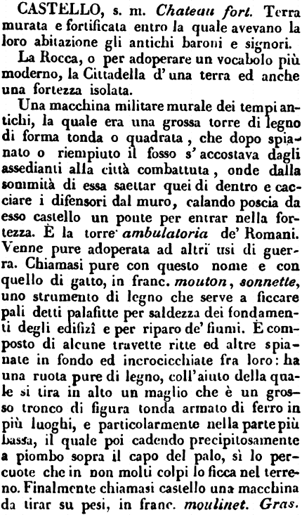 La Rocca, o per adoperare un vocabolo più moderno, la Cittadella d'una terra ed anche una fortezza isolata. Una macchina militare murale dei tempi antichi, la quale era una grossa torre di legno di forma tonda o quadrata, che dopo spianato o riempiuto il fosso s'accostava dagli assedianti alla città combattuta, onde dalla sommità di essa saettar quei di dentro e cacciare i difensori dal muro, calando poscia da esso castello un ponte per entrar nella fortezza. È la torre ambulatoria de' Romani. Venne pure adoperata ad altri usi di guerra. Chiamasi pure con questo nome e con quello di gatto, in franc. mouton, sonnette, uno strumento di legno che serve a ficcare pali detti palafitte per saldezza dei fondamenti degli edifizî e per riparo de' fiumi. È composto di alcune travette ritte ed altre spianate in fondo ed incrocicchiate fra loro: ha una ruota pure di legno, coll'aiuto della quale si tira in alto un maglio che è un grosso tronco di figura tonda armato di ferro in più luoghi, e particolarmente nella parte più bassa, il quale poi cadendo precipitosamente a piombo sopra il capo del palo, sì lo percuote che in non molti colpi lo ficca nel terreno. Finalmente chiamasi castello una macchina da tirar su pesi, in franc. moulinet. Gras. [immagine] |