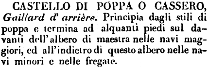 | Castello di poppa o Cassero - Gaillard d'arrière. Principia dagli stili di poppa e termina ad alquanti piedi sul davanti dell'albero di maestra nelle navi maggiori, ed all'indietro di questo albero nelle navi minori e nelle fregate. [immagine] |