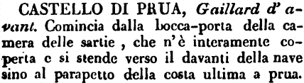 | Castello di prua - Gaillard d'avant. Comincia dalla bocca-porta della camera delle sartie, che n'è interamente coperta e si stende verso il davanti della nave sino al parapetto della costa ultima a prua. [immagine] |