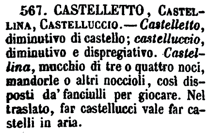 | Castelletto, Castellina, Castelluccio - Castelletto, diminutivo di castello; castelluccio, diminutivo e dispregiativo. Castellina, mucchio di tre o quattro noci, mandorle o altri noccioli, così disposti da' fanciulli per giocare. Nel traslato, far castellucci vale far castelli in aria. [immagine] |