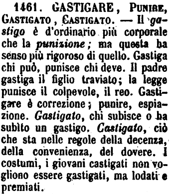 | Gastigare, Punire, Gastigato, Castigato - Il gastigo è d'ordinario più corporale che la punizione; ma questa ha senso più rigoroso di quello. Gastiga chi può, punisce chi deve. Il padre gastiga il figlio traviato; la legge punisce il colpevole, il reo. Gastigare è correzione; punire, espiazione. Gastigato, chi subisce o ha subìto un gastigo. Castigato, ciò che sta nelle regole della decenza, della convenienza, del dovere. I costumi, i giovani castigati non vogliono essere gastigati, ma lodati e premiati. [immagine] |