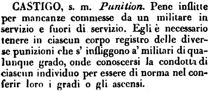 | Castigo - s. m. Punition. Pene inflitte per mancanze commesse da un militare in servizio e fuori di servizio. Egli è necessario tenere in ciascun corpo registro delle diverse punizioni che s'infliggono a' militari di qualunque grado, onde conoscersi la condotta di ciascun individuo per essere di norma nel conferir loro i gradi o gli ascensi. [immagine] |