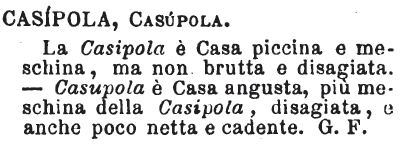 | Casipola, Casupola - La Casipola è Casa piccina e meschina, ma non brutta e disagiata. - Casupola è Casa angusta, più meschina della Casipola, disagiata, e anche poco netta e cadente. G. F. [immagine] |