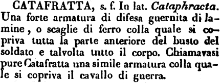 | Catafratta - s. f. In lat. Cataphracta. Una forte armatura di difesa guernita di lamine, o scaglie di ferro colla quale si copriva tutta la parte anteriore del busto del soldato e talvolta tutto il corpo. Chiamavasi pure Catafratta una simile armatura colla quale si copriva il cavallo di guerra. [immagine] |