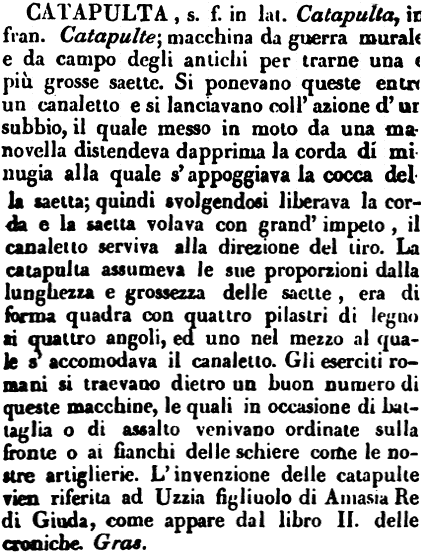 | Catapulta - Macchina da guerra inventata dai Sirj. Gli antichi se ne servivano per lanciare ad un tempo stesso sui nemici grosse pietre e freccie lunghe dodici o quindici piedi. L'invenzione della polvere la fece porre in dimenticanza. [immagine] |