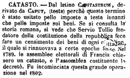 | Catasto - S. m. Registro e Stima de' beni stabili. T. Non dal gr. Καθ'ἓκαστον, nè forse da Καθίσταμαι, nè dal peso dell'imposta grave quasi Catasta, ma dall'Accatastare, cioè Mettere insieme, le rendite, acciocchè siano i pesi a quelle proporzionati, togliendo le inique disuguaglianze. Il Diez dal Capitularium, in cui scrivevansi i tributi, si fa un Capitastrum. = Tac. Dav. Ann. 14. 196. (C) Per le Gallie fecero il catasto Quinto Volusio e Sesto Affricano e Trebellio Massimo. T. Attuare il catasto. – Catasto stabile, per provvisione, per approssimazione. – Libri di… – Rivederlo.