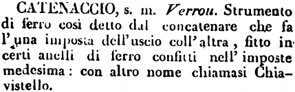 | Catenaccio - s. m. Verrou. Strumento di ferro così detto dal concatenare che fa l'una imposta dell'uscio coll'altra, fitto in certi anelli di ferro confitti nell'imposte medesima: con altro nome chiamasi Chiavistello. [immagine] |