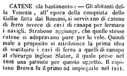 | Catene (da bastimento) - Gli abitanti della Venezia, all'epoca della conquista delle Gallie fatta dai Romani, si servivano di catene di ferro invece di cavi di canapa per fermare i navigli. Strabone aggiunge, che quelle stesse catene si adopravano pure per le vele. Quindi male a proposito si attribuisce la prima idea di sostituire i cavi di ferro a quelli di canapa al chirurgo inglese Slater, il quale prese nel 1808 una patente per questo oggetto. Il capitano Brown fu il primo ad impiegarle nel 1811. [immagine] |