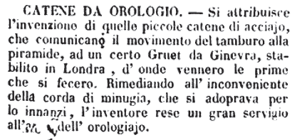 | Catene da orologio - Si attribuisce l'invenzione di quelle piccole catene di acciajo, che comunicano il movimento del tamburo alla piramide, ad un certo Gruet da Ginevra, stabilito in Londra, d'onde vennero le prime che si fecero. Rimediando all'inconveniente della corda di minugia, che si adoprava per lo innanzi, l'inventore rese un gran servigio all'arte dell'orologiajo. [immagine] |