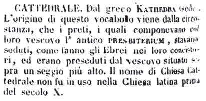 | Cattedrale - Dal greco Kathedra (sede). L'origine di questo vocabolo viene dalla circostanza, che i preti, i quali componevano col loro vescovo l'antico presbiterium, stavano seduti come facevano gli Ebrei nei loro concistori, ed erano presieduti dal vescovo situato sopra un seggio più alto. Il nome di Chiesa Cattedrale non fu in uso nella Chiesa latina prima del secolo X. [immagine] |