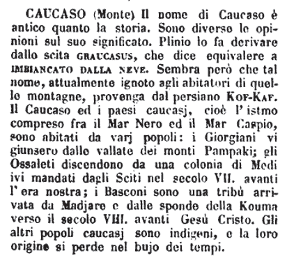 | Caucaso (Monte) - Il nome di Caucaso è antico quanto la storia. Sono diverse le opinioni sul suo significato. Plinio lo fa derivare dallo scita graucasus, che dice equivalere a imbiancato dalla neve. Sembra però che tal nome, attualmente ignoto agli abitatori di quelle montagne, provenga dal persiano Kof-Kaf. Il Caucaso ed i paesi caucasj, cioè l'istmo compreso fra il Mar Nero ed il Mar Caspio, sono abitati da varj popoli: i Giorgiani vi giunsero dalle vallate dei monti Pampaki; gli Ossaleti discendono da una colonia di Medi ivi mandati dagli Sciti nel secolo VII. avanti l'era nostra; i Basconi sono una tribù arrivata da Madjare e dalle sponde della Kouma verso il secolo VIII. avanti Gesù Cristo. Gli altri popoli caucasj sono indigeni, e la loro origine si perde nel bujo dei tempi. [immagine] |