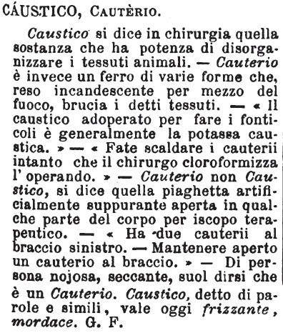| Caustico, Cauterio - Caustico si dice in chirurgia quella sostanza che ha potenza di disorganizzare i tessuti animali. - Cauterio è invece un ferro di varie forme che, reso incandescente per mezzo del fuoco, brucia i detti tessuti. - «Il caustico adoperato per fare i fonticoli è generalmente la potassa caustica.» - «Fate scaldare i cauterii intanto che il chirurgo cloroformizza l'operando.» - Cauterio non Caustico, si dice quella piaghetta artificialmente suppurante aperta in qualche parte del corpo per iscopo terapeutico. - «Ha due cauterii al braccio sinistro. - Mantenere aperto un cauterio al braccio.» - Di persona nojosa, seccante, suol dirsi che è un Cauterio. Caustico, detto di parole e simili, vale oggi frizzante, mordace. G. F. [immagine] |