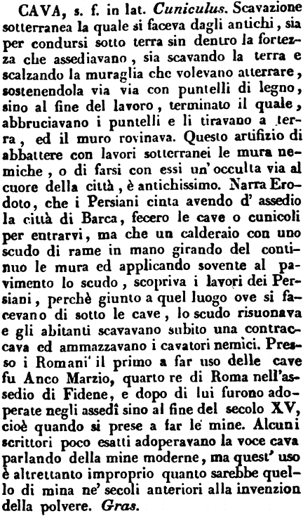 | Cava - s. f. in lat. Cuniculus. Scavazione sotterranea la quale si faceva dagli antichi, sia per condursi sotto terra sin dentro la fortezza che assediavano, sia scavando la terra e scalzando la muraglia che volevano atterrare, sostenendola via via con puntelli di legno, sino al fine del lavoro, terminato il quale, abbruciavano i puntelli e li tiravano a terra, ed il muro rovinava. Questo artifizio di abbattere con lavori sotterranei le mura nemiche, o di farsi con essi un'occulta via al cuore della città, è antichissimo. Narra Erodoto, che i Persiani cinta avendo d'assedio la città di Barca, fecero le cave o cunicoli per entrarvi, ma che un calderaio con uno scudo di rame in mano girando del continuo le mura ed applicando sovente al pavimento lo scudo, scopriva i lavori dei Persiani, perchè giunto a quel luogo ove si facevano di sotto le cave, lo scudo risuonava e gli abitanti scavavano subito una contraccava ed ammazzavano i cavatori nemici. Presso i Romani il primo a far uso delle cave fu Anco Marzio, quarto re di Roma nell'assedio di Fidene, e dopo di lui furono adoperate negli assedî sino al fine del secolo XV, cioè quando si prese a far le mine. Alcuni scrittori poco esatti adoperavano la voce cava parlando delle mine moderne, ma quest'uso è altrettanto improprio quanto sarebbe quello di mina ne' secoli anteriori alla invenzion della polvere. Gras. [immagine] |