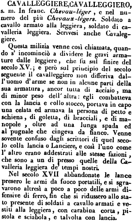 Questa milizia venne così chiamata, quando s'incominciò a dividere le gravi armature dalle leggiere, che fu sul finire del secolo XV.; e però sul principio del secolo seguente il cavalleggiero non differiva dall'uomo d'arme se non in alcune parti della sua armatura, ancor tutta di acciaio, ma di minor peso dell'altra: egli combatteva con la lancia e collo stocco, portava in capo una celata ed armava la persona di petto e schiena, di goletta, di bracciali, e di manopole, oltre ad una lunga spada ed al pugnale che cingeva da fianco. Venne sovente confuso dagli scrittori di quel secolo colla lancia o Lanciere, e così l'uno come l'altro erano addestrati alle stesse fazioni, che sono a un di presso quelle della Cavalleria leggiera de' tempi nostri. Nel secolo XVII abbandonate le lance presero le armi da fuoco portatili, e si sgravarono altresì a poco a poco delle armi difensive di ferro, fin che si ridussero allo stato presente di soldati a cavallo armati e vestiti alla leggiera, con carabina corta, pistola e sciabola, e talvolta con lancia. [immagine] |