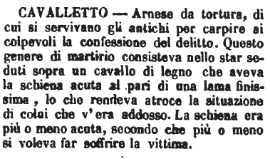 | Cavalletto - Arnese da tortura, di cui si servivano gli antichi per carpire ai colpevoli la confessione del delitto. Questo genere di martirio consisteva nello star seduti sopra un cavallo di legno che aveva la schiena acuta al pari di una lama finissima, lo che rendeva atroce la situazione di colui che v'era addosso. La schiena era più o meno acuta, secondo che più o meno si voleva far soffrire la vittima. [immagine] |
