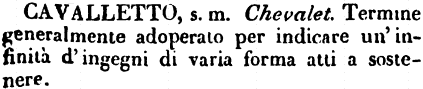 | Cavalletto - s. m. Chevalet. Termine generalmente adoperato per indicare un'infinità d'ingegni di varia forma atti a sostenere. [immagine] |