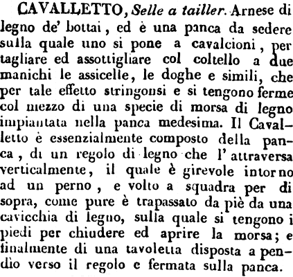 | Cavalletto - Selle a tailler. Arnese di legno de' bottai, ed è una panca da sedere sulla quale uno si pone a cavalcioni, per tagliare ed assottigliare col coltello a due manichi le assicelle, le doghe e simili, che per tale effetto stringonsi e si tengono ferme col mezzo di una spegie di morsa di legno impiantata nella panca medesima. Il Cavalletto è essenzialmente composto della panca, di un regolo di legno che l'attraversa verticalmente, il quale è girevole intorno ad un perno, e volto a squadra per di sopra, come pure è trapassato da piè da una cavicchia di legno, sulla quale si tengono i piedi per chiudere ed aprire la morsa; e finalmente di una tavoletta disposta a pendio verso il regolo e fermata sulla panca. [immagine] |