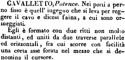 | Cavalletto - Potence. Nei porti a perno fisso è quell'ingegno che si leva per reggere il cavo e dicesi faina, a cui sono ormeggiati.