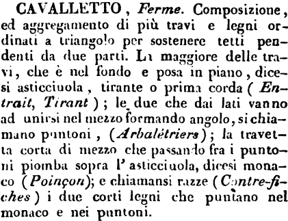 | Cavalletto - Ferme. Composizione, ed aggregamento di più travi e legni ordinati a triangolo per sostenere tetti pendenti da due parti. La maggiore delle travi, che è nel fondo e posa in piano, dicesi asticciuola, tirante o prima corda (Entrait, Tirant); le due che dai lati vanno ad unirsi nel mezzo formando angolo, si chiamano puntoni, (Arbalétriers); la travetta corta di mezzo che passando fra i puntoni piomba sopra l'asticciuola, dicesi monaco (Poinçon); e chiamansi razze (Contre-fiches) i due corti legni che puntano nel monaco e nei puntoni. [immagine] |