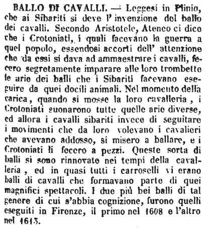 | Ballo di cavalli - Leggesi in Plinio, che ai Sibariti si deve l'invenzione del ballo dei cavalli. Secondo Aristotele, Ateneo ci dice che i Crotoniati, i quali facevano la guerra a quel popolo, essendosi accorti dell'attenzione che da essi si dava ad ammaestrare i cavalli, fecero segretamente imparare alle loro trombette le arie dei balli che i Sibariti facevano eseguire da quei docili animali. Nel momento della carica, quando si mosse la loro cavalleria, i Crotoniati suonarono tutte quelle arie diverse, ed allora i cavalli sibariti invece di seguitare i movimenti che da loro volevano i cavalieri che avevano addosso, si misero a ballare, e i Crotoniati li fecero a pezzi. Queste sorta di balli si sono rinnovate nei tempi della cavalleria, ed in quasi tutti i carroselli vi erano balli di cavalli che formavano parte di quei magnifici spettacoli. I due più bei balli di tal genere di cui s'abbia cognizione, furono quelli eseguiti in Firenze, il primo nel 1608 e l'altro nel 1613. [immagine] |