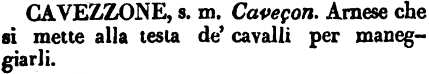 | Cavezzone - s. m. Caveçon. Arnese che si mette alla testa de' cavalli per maneggiarli. [immagine] |