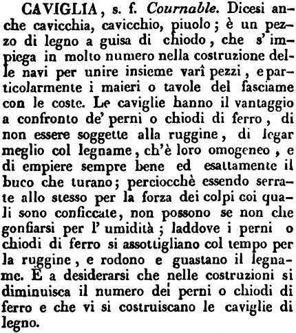 (Mar.) (Tom.) Se ne servono a commettere insieme i legni che formano il corpo della nave, per risparmio de' chiodi di rame: se ne servono per ritenere i cappii scorsoi: inoltre, come d'istrumento per fare arnesi marinareschi, come raccapezzare corde spezzate, e sim. [Cont.] Giorgi, Spir. Er. 57. Fibbia è… quel chiodo, caviglia, o perno, che voglimo dire, che congiunge assieme i travicelli in un capo, acciò possino dislargarsi nell'altra per diversi motivi, e usi. G. G. L. Conosciuta la resistenza di un piccol chiodo o di una piccola caviglia di legno, io potrò dimostrativamente sapere le resistenze di tutti i chiodi, di tutte le travi, travicelli, antenne, alberi. 2. [Val.] Attaccare, Legare l'asino a buona caviglia. Dormir della buona, saporitamente, profondamente. Fir. Nov. 6. Parendole che Niccolò avesse, come si dice, legato l'asino a buona caviglia, le venne voglia… T. Prov. Tosc. 327. Attacca l'asino a una buona caviglia. (Assicura le cose.) 3. [Val.] Badare alla caviglia e al panno. Prov. Starsi attento di non commettere errore. Menz. Sat. 1. Badate dunque alla caviglia e al panno, Nè state a criticar Marsilio e Pico. 4. (Anat.) Quell'Osso della gamba, che arriva dal collo del piede al ginocchio, che noi diciamo anche Fusolo e Fucile. M. Aldobr. (C) E queste medesime vene puote l'uomo trovare di sopra dalle caviglie di dietro dal tallone. Le vene che sono dal lato dentro, sotto le caviglie, fa l'uomo segnare… E appresso: E chi ha 'l fusolo, ovvero le caviglie delle gambe grosse igualmente, si è senza vergogna, e pesante e lento. (Ar. Mes.) [Cont.] Caviglia dell'orditojo. Cit. Tipocosm. 439. Le arti per tessere contengono i sciamitari co' i loro istrumenti, cioè… le girelle, i licci, la licciatura, il pettine, le casse, il carretto, le caviglie. Bandi Lucch. 181. Quelli orditoi abbiano da l'uno lato a l'altro delle caviglie braccia viiij. (Ar. Mes.) [Cont.] Caviglia del tintore. Fiorav. Spec. sci. I. 21. Il tentore prima la cuoce (la seta) con acqua, e sapone, e poi la tenge di che color si vuole, e torna al mercante, il qual la mette alle caviglie, con le quali la distira benissimo, e la fa diventare lustra e bella. 5. (Mar.) [Fin.] Cilindretto di metallo o di legno servente a varii usi. [Cont.] Pant. Arm. mar. Voc. Perni o caviglie di legno, che tengono insieme i vasi, o letti dei vascelli, che si varano. 6. (Ar. Mes.) Caviglia a conio. Piccolo Conio o Caviglietta di legno quadrata ed aguzza, la quale, posta ad un capo d'altra caviglia, serve ad ingrossarla. (Mt.) 7. T. Modo di cel. non com. V. es. in CAVICCHIO. |