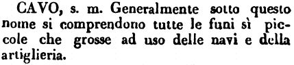 | Cavo - s. m. Generalmente sotto questo nome si comprendono tutte le funi sì piccole che grosse ad uso delle navi e della artiglieria. [immagine] |