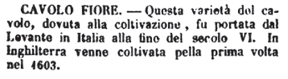 | Cavolo fiore - Questa varietà del cavolo, dovuta alla coltivazione, fu portata dal Levante in Italia alla fine del secolo VI. In Inghilterra venne coltivata pella prima volta nel 1603. [immagine] |