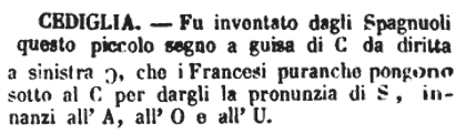 | Cediglia - Fu inventato dagli Spagnoli questo piccolo segno a guisa di C da diritta a sinistra Ɔ, che i Francesi puranche pongono sotto al C per dargli la pronunzia di S, innanzi all'A, all'O e all'U. [immagine] |