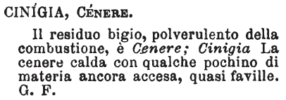 | Cinigia, Cenere - Il residuo bigio, polverulento della combustione, è Cenere; Cinigia La cenere calda con qualche pochino di materia ancora accesa, quasi faville. G.F. [immagine] |