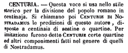 | Centuria - Questa voce si usa nello stile storico per la divisione del popolo romano in centinaja. Si chiamano poi Centurie di Nostradamus le predizioni di questo autore, disposte a centinaia di sestine o quartine. Per imitazione furono dette Centurie certe quartine ed altri componimenti fatti nel genere di quelli di Nostradamus. [immagine] |