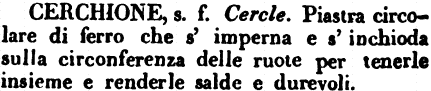 | Cerchione - s. f. Cercle. Piastra circolare di ferro che s'imperna e s'inchioda sulla circonferenza delle ruote per tenerle insieme e renderle salde e durevoli. [immagine] |