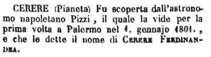 | Cerere (Pianeta) - Fu scoperta dall'astronomo napoletano Pizzi, il quale la vide per la prima volta a Palermo nel 4. gennajo 1801., e che le dette il nome di Cerere Ferdinandea. [immagine] |