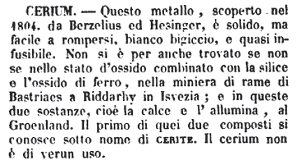 | Cerium - Questo metallo, scoperto nel 1804, da Berzelius ed Hesinger, è solido, ma facile a rompersi, bianco bigiccio, e quasi infusibile. Non si è per anche trovato se non se nello stato d'ossido combinato con la silice e l'ossido di ferro, nella miniera di rame di Bastriaes a Riddarhy in Isvezia; e in queste due sostanze, cioè la calce e l'allumina, al Groenland. Il primo di quei due composti si conosce sotto nome di cerite. Il cerium non è di verun uso. [immagine] |