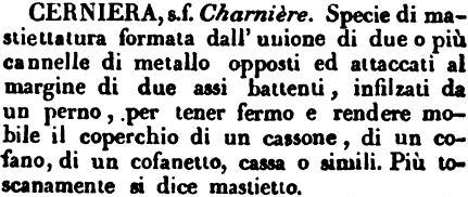 | Cerniera - s. f. Charnière. Specie di mastiettatura formata dall'unione di due o più cannelle di metallo opposti ed attaccati al margine di due assi battenti, infilzati da un perno, per tener fermo e rendere mobile il coperchio di un cassone, di un cofano, di un cofanetto, cassa o simili. Più toscanamente si dice mastietto. [immagine] |