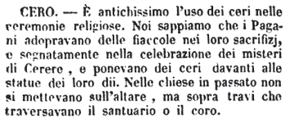 | Cero - E' antichissimo l'uso dei ceri nelle ceremonie religiose. Noi sappiamo che i Pagani adopravano delle fiaccole nei loro sacrifizj, e segnatamente nella celebrazione dei misteri di Cerere, e ponevano dei ceri davanti alle statue dei loro dii. Nelle chiese in passato non si mettevano sull'altare, ma sopra travi che traversavano il santuario o il coro. [immagine] |