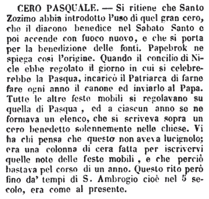 | Cero pasquale - Si ritiene che Santo Zozimo abbia introdotto l'uso di quel gran cero, che il diacono benedice nel Sabato Santo e poi accende con fuoco nuovo, e che si porta per la benedizione delle fonti. Papebrok ne spiega così l'origine. Quando il concilio di Nicle ebbe regolato il giorno in cui si celebrerebbe la Pasqua, incaricò il Patriarca di farne fare ogni anno il canone ed inviarlo al Papa. Tutte le altre feste mobili si regolavano su quella di Pasqua, ed a ciascun anno se ne formava un elenco, che si scriveva sopra un cero benedetto solennemente nelle chiese. Vi ha chi pensa che questo non aveva lucignolo; era una colonna di cera fatta per iscrivervi quelle note delle feste mobili, e che perciò bastava pel corso di un anno. Questo rito però fino da' tempi di S. Ambrogio cioè nel 5 secolo, era come al presente. [immagine] |