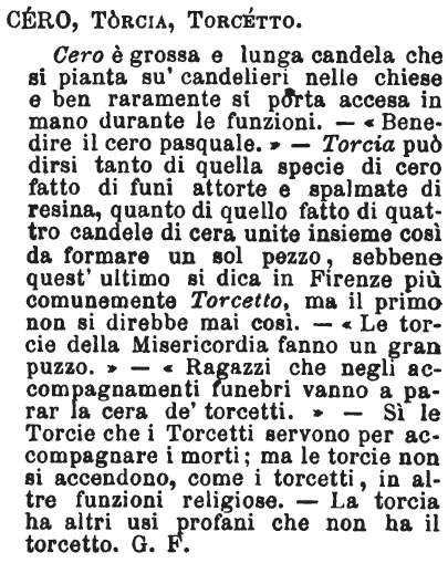 | Cero, Torcia, Torcetto - Cero è grossa e lunga candela che si pianta su' candelieri nelle chiese e ben raramente si porta accesa in mano durante le funzioni. - «Benedire il cero pasquale.» - Torcia può dirsi tanto di quella specie di cero fatto di funi attorte e spalmate di resina, quanto di quello fatto di quattro candele di cera unite insieme così da formare un sol pezzo, sebbene quest'ultimo si dica in Firenze più comunemente Torcetto, ma il primo non si direbbe mai così. - «Le torcie della Misericordia fanno un gran puzzo.» - «Ragazzi che negli accompagnamenti funebri vanno a parar la cera de' torcetti.» - Sì le Torcie che i Torcetti servono per accompagnare i morti; ma le torcie non si accendono, come i torcetti, in altre funzioni religiose. - La torcia ha altri usi profani che non ha il torcetto. G. F. [immagine] |